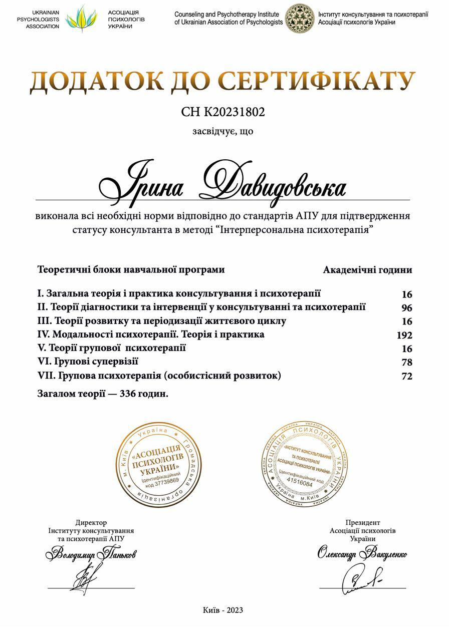 Меня зовут Ирина, я сертифицированный специалист, рекомендованный Ассоциацией психологов Украины.