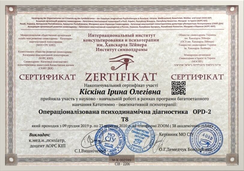 - Международный Институт Консультирования и психотерапии имени Ханскарла Лёйнера - Операционализированная психодинамическая диагностика, 2020 г