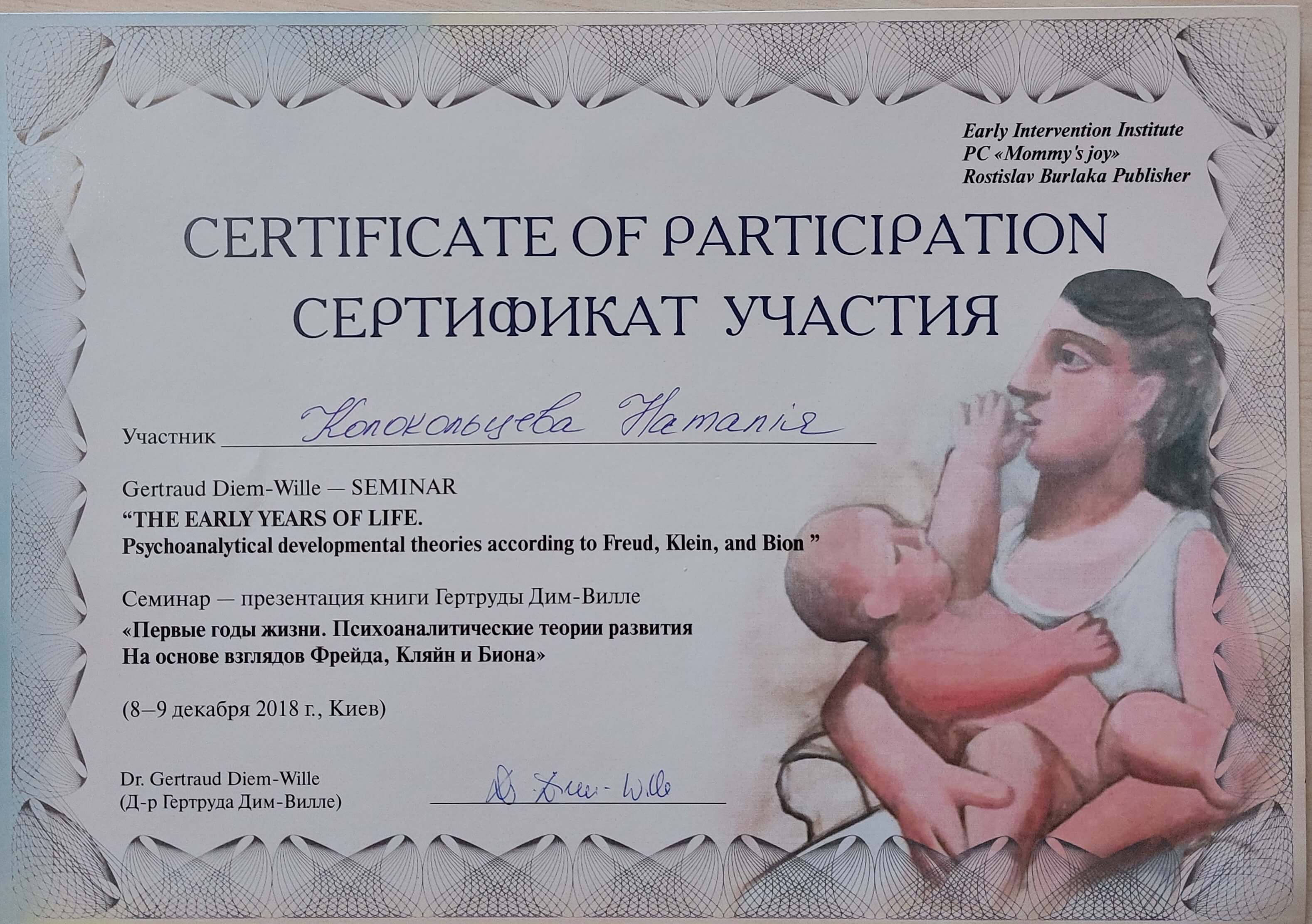 - Курс "Первые годы жизни. Психоаналитические теории развития На основе взглядов Фрейда, Кляйн и Биона", 2018 г